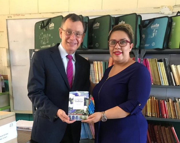 En reunión con el Director Cubero, se informó del Programa "Apoyo a las Escuelas Chile de ALC" -convenio suscrito entre la Agencia Chilena de Cooperación Internacional para el Desarrollo (AGCID) y el CIAE - U. de Chile- y se hizo entrega de 35 ejemplares del libro "Yo soy la feliz Violeta", de la colección infantil y juvenil realizada por la Biblioteca Nacional y la Dirección de Asuntos Culturales (DIRAC) del Ministerio de Relaciones Exteriores de nuestra Cancillería, que conmemora el natalicio de Violeta Parra.