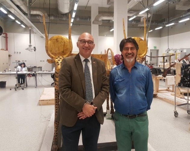 El Profesor Arriaza visitó las pirámides de Giza, cuya actividad fue organizada por el Ministerio de Antigüedades y fue recibido por el Director del Grand Egyptian Museum, el arqueólogo Tarek Tawfik, con quien visitó los laboratorios del Centro de Conservación de dicha institución, en particular aquellos destinados a materias orgánicas, donde se analizan las momias egipcias.