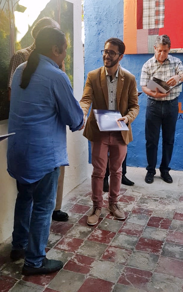 Miguel Ángel Ramírez saluda al cónsulde Chile, Nicolás Rosson (derecha), durante la inauguración de la exposición "Colores para la humanidad".