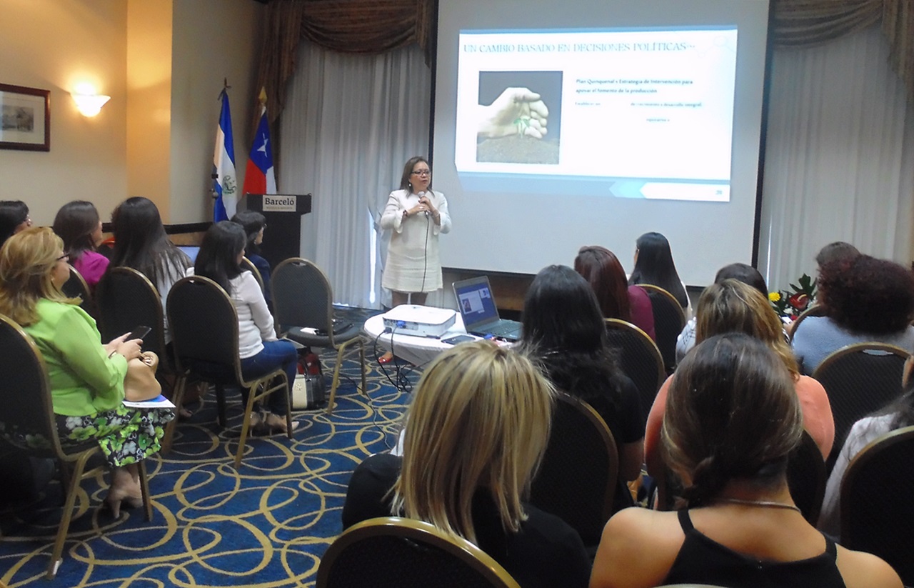 La Directora Ejecutiva de la Comisión Nacional de la Micro y Pequeña Empresa (CONAMYPE), Ileana Rogel durante su intervención esta mañana en la inauguración del Seminario "Empoderamiento económico de la mujer".
