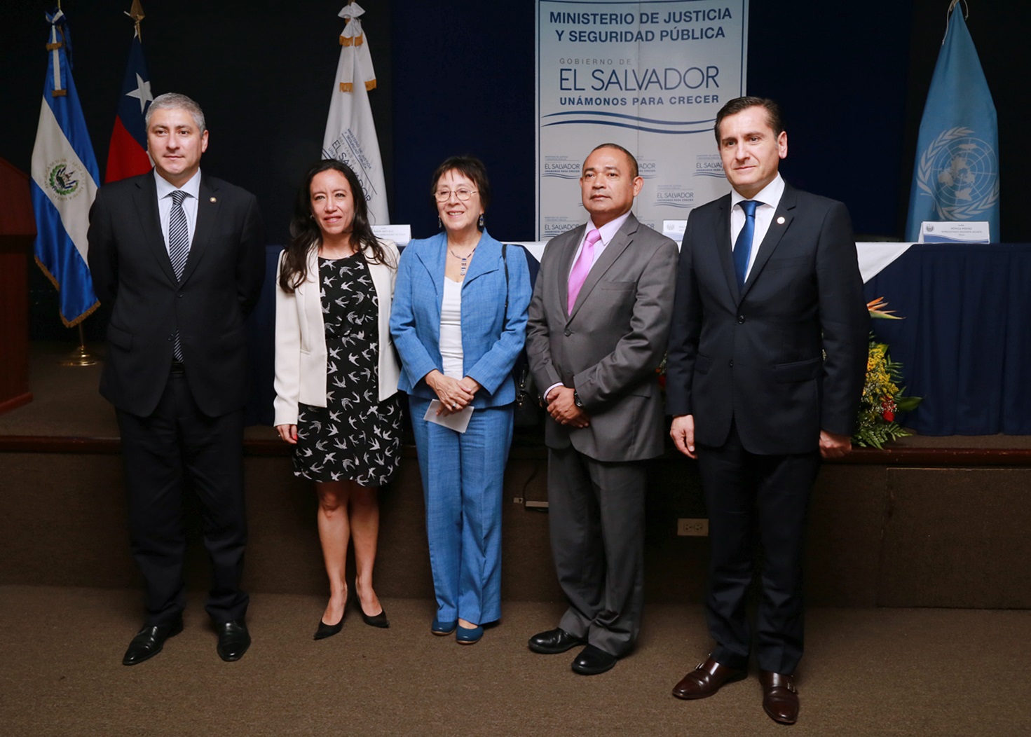 De izquierda a derecha: Comisario Manuel Muñoz (PDI), Representante Adjunta del PNUD en El Salvador, Mónica Merino, Embajadora de Chile María Inés Ruz, Ministro de Justicia y Seguridad Pública, Mauricio Ramírez Landaverde y Subprefecto Luis Torralba (PDI).