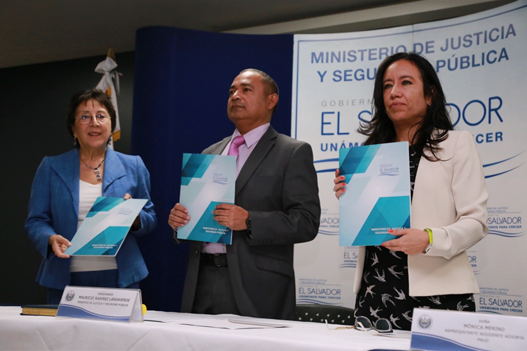 Esta mañana en ceremonia encabezada por el Ministro de Justicia y Seguridad Pública, Mauricio Ramírez Landaverde, se firmó la Declaración de Intenciones para el Fortalecimiento de Alianzas y Sinergias en Materia de Seguridad Ciudadana, entre el Ministerio de Justicia y Seguridad Pública de la República de El Salvador, La República de Chile y el Programa de Naciones Unidas para el Desarrollo (PNUD).