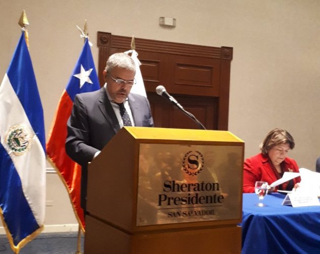 De izquierda a derecha: el Encargado de negocios a. i. de la Embajada de Chile, Juan Vega; Procuradora General de la República de El Salvador, Sonia Cortez de Madriz y Renato González de la Defensoría Penal Pública de Chile, durante la inauguración del taller "Técnicas de litigación oral en materia de defensa penal para adultos".
