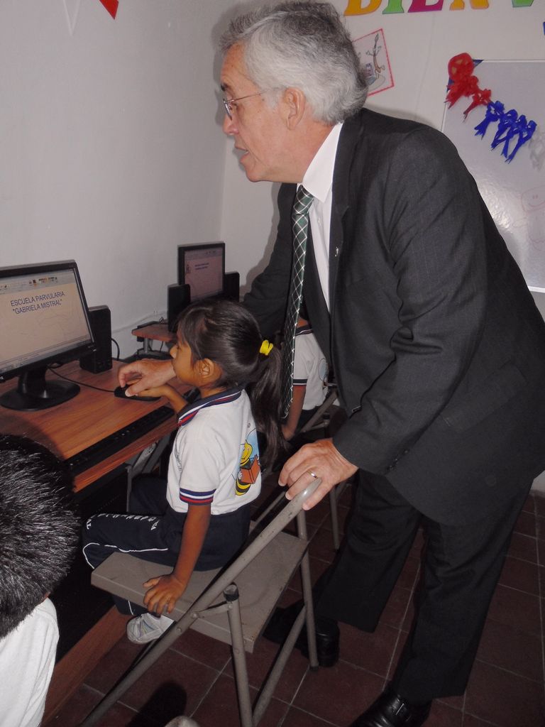 El embajador de Chile en El Salvador, Renato Sepúlveda Nebel, ayuda a una pequeña de la Escuela Parvularia Gabriela Mistral a operar una de las seis computadoras donadas a dicho centro por el Gobierno de Chile.