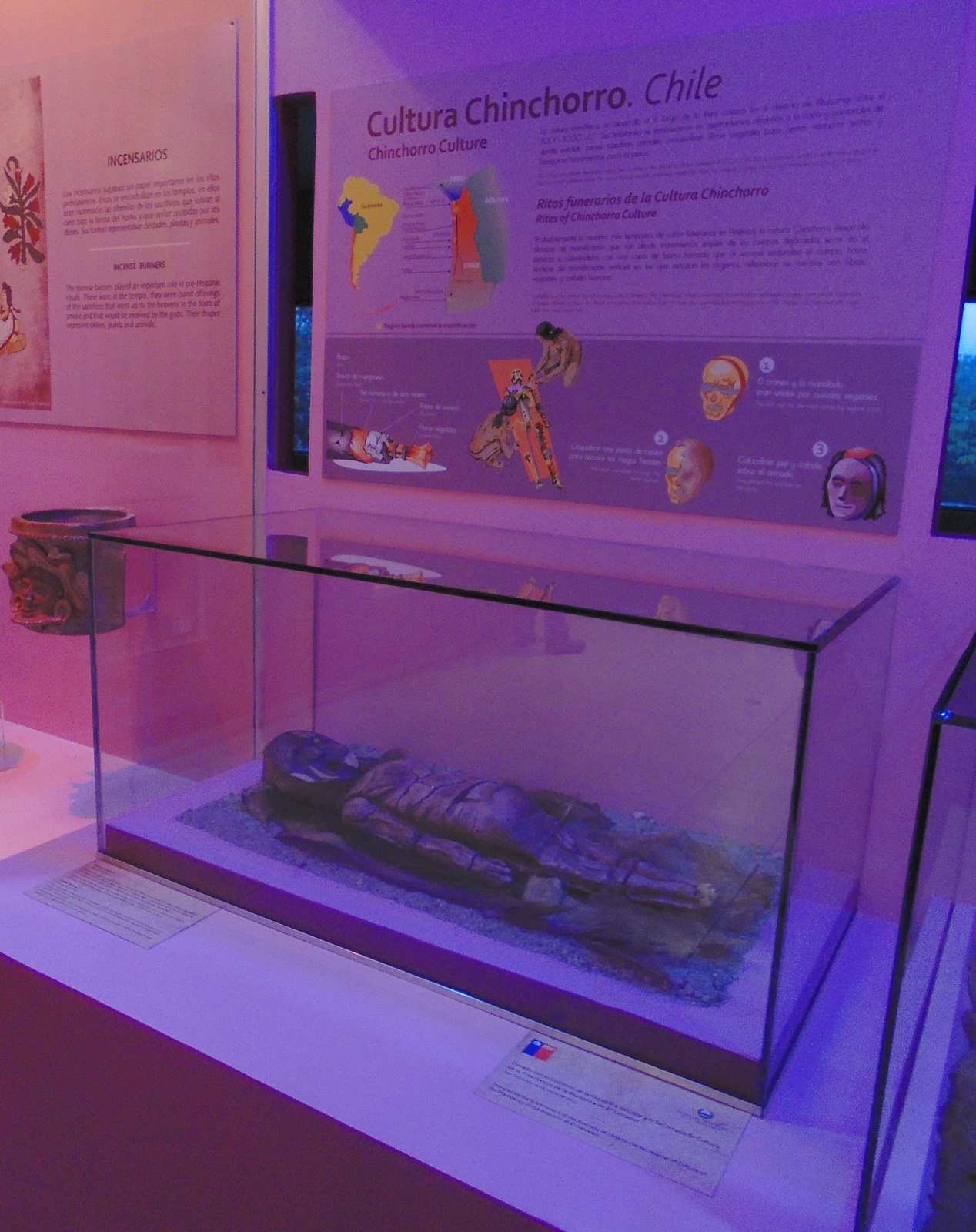 La pieza donada es réplica del cuerpo de una niña momificada estilo roja, elaborada por antropólogos de la Universidad de Tarapacá, Chile. Obtiene su nombre debido a la coloración rojiza que adquiría el cuerpo al ser pintado con óxido férrico como parte del ritual de momificación. La preparación del cuerpo incluía la remoción de los órganos a través de incisiones. Para proveer la rigidez se deslizaban maderos puntiagudos debajo de la piel y luego las cavidades eran rellenadas con tierra, plumas y arcilla. A manera de decoración se colocaba una larga peluca de pelo humano que aseguraban con un casquete de arcilla.