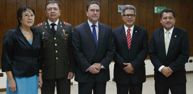 La embajadora de Chile, María Inés Ruz, junto al Ministro de Defensa de El Salvador, Gral. David Munguía Payés; el Ministro de Defensa de Chile, Sr. José Antonio Gómez, el Viceministro de Relaciones Exteriores, Integración y Promoción Económica, Carlos Castaneda y el Presidente de la Comisión de Defensa de la Asamblea Legislativa, diputado Juan Carlos Mendoza Portillo (de izquierda a derecha).