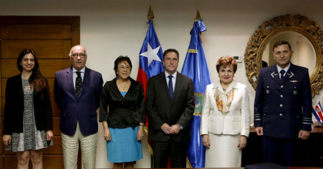 De izquierda a derecha: Daniela Sepúlveda, Coordinadora Depto. de América del Sur, Central y Caribe de la Subsecretaría de Defensa; Sr. Renán Fuentealba, Jefe División de Relaciones Internacionales de Subsecretaría de Defensa; embajadora de Chile María Inés Ruz; Ministro de Defensa de Chile, José Antonio Gómez; Secretaria del SICA, Dra. Victoria Marina de Avilés y Gral. Arturo Merino, Jefe Estado Mayor Conjunto de Chile.