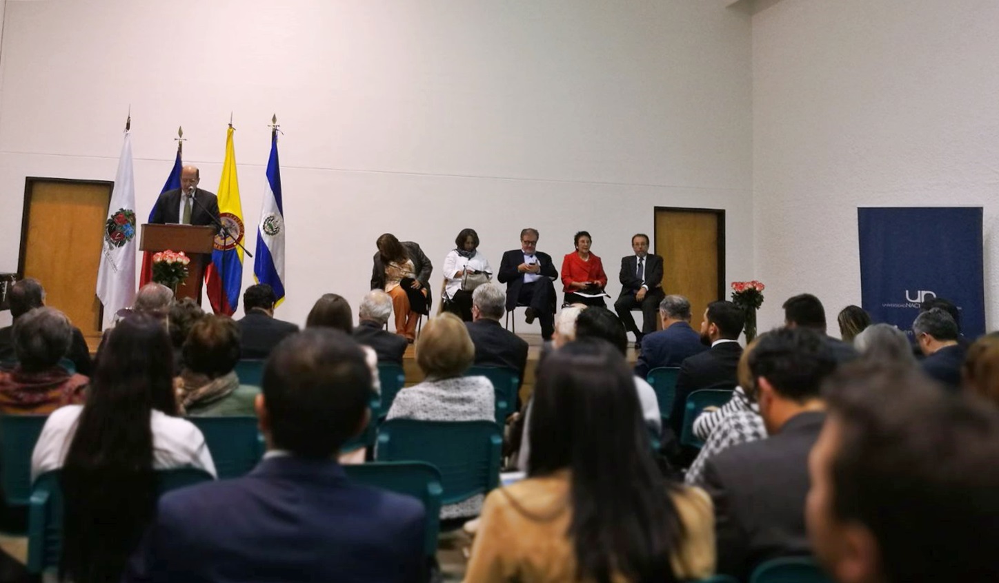 Durante la presentación del libro, en la imagen (de izquierda a derecha) Alejo Vargas (director del Centro de Pensamiento y Seguimiento al Diálogo de Paz de la UN), Francisco Jovel, Ana Guadalupe Martínez, Luis Maira, Nidia Díaz, Ricardo Rojas (Encargado de Negocios Embajada de Chile en Colombia); Embajadora de Chile en El Salvador, María Inés Ruz; Humberto Galindo (Embajador de El Salvador en Colombia) y Jaime Franky (Vicerrector de la UN).