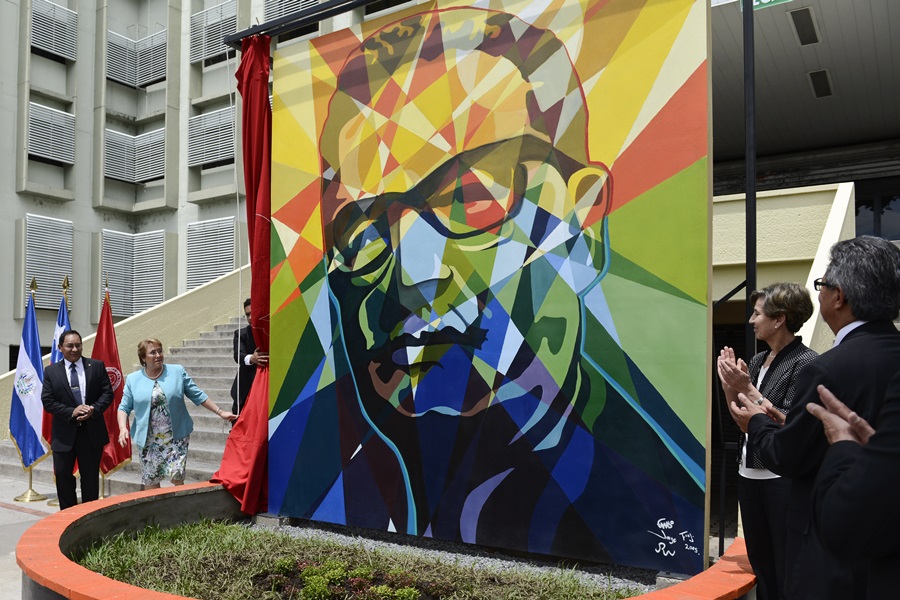 Presidenta Bachelet devela mural artístico en homenaje al ex presidente chileno Salvador Allende en la plaza que lleva su nombre, ubicada frente a la Facultad de Medicina de la Universidad de El Salvador.