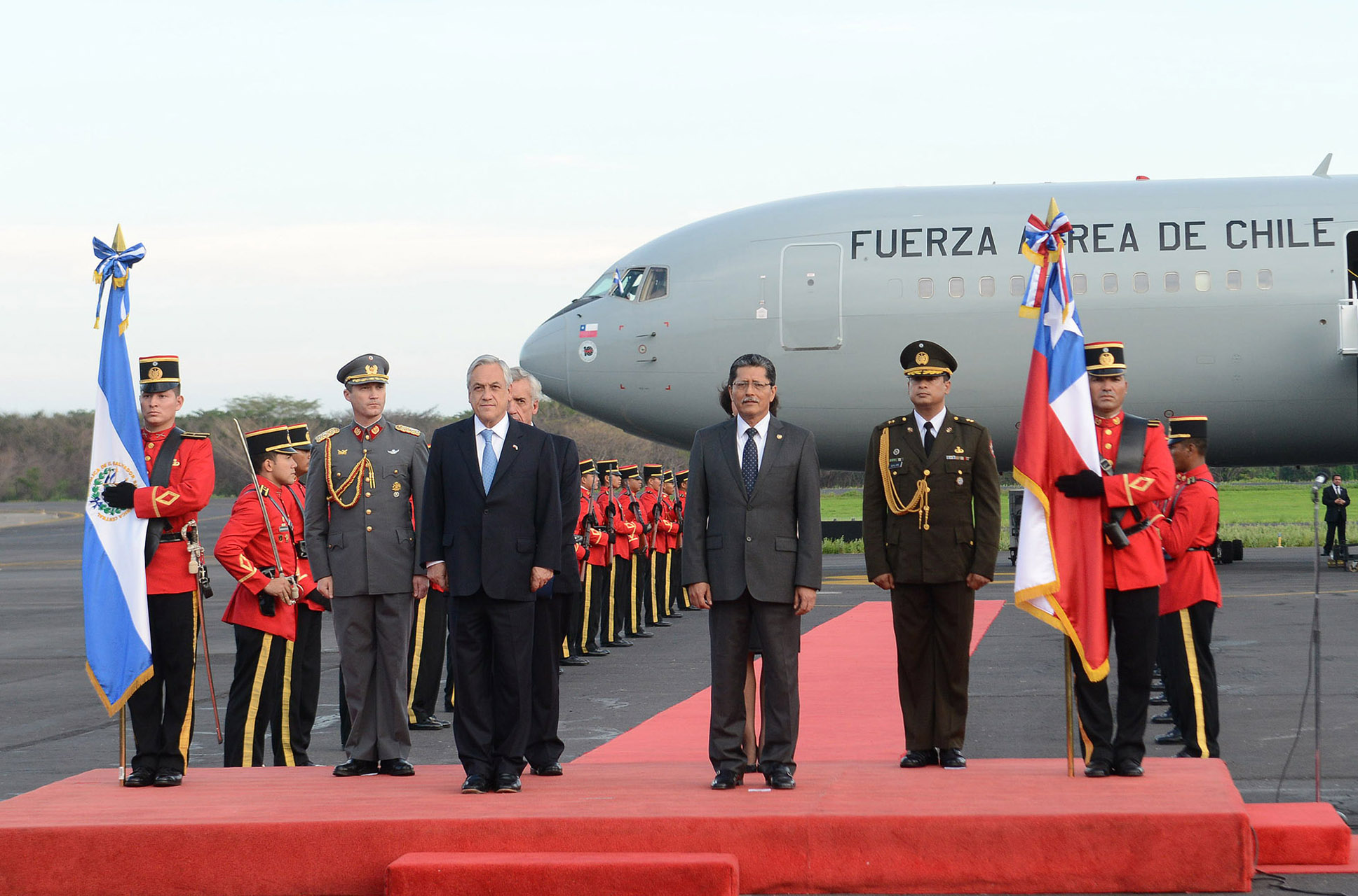 A su llegada en horas de la tarde al Aeropuerto Internacional de Comalapa en San Salvador, el Presidente Piñera fue recibido por el Viceministro de Cooperación para el Desarrollo Jaime Miranda. En sus primeras palabras el mandatario recalcó los lazos de amistad que unen a ambas naciones desde hace mucho tiempo, además resaltó la nobleza y fortaleza de El Salvador como país.