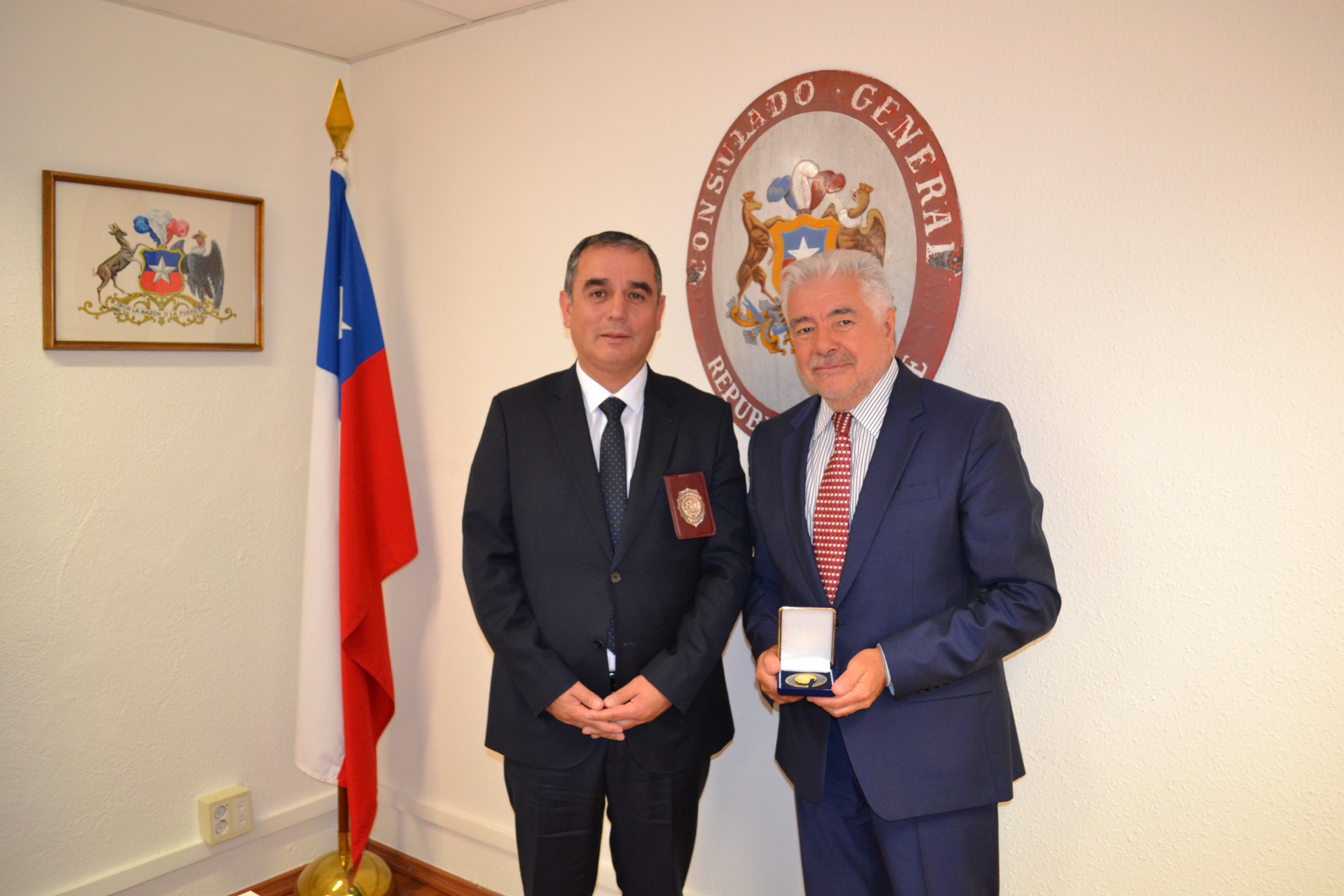 El Cónsul General recibió el lunes 1 de octubre a una delegación de oficiales de la Policía de Investigaciones de Chile (PDI) y de Gendarmería, a cargo del Prefecto César Cortés Pineda, Director de la Academia Superior de Estudios Policiales (ASEPOL) y del Comisario Cristian Benavides Moraga, Secretario de Estudios.