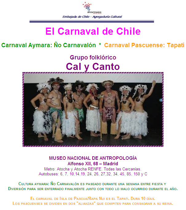 En el Museo Nacional de Antropología de Madrid se celebró la Tapati ,la famosa fiesta pascuense, con la participación de los integrantes del conjunto Cal y Canto integrado por 25 bailarines, principalmente chilenos residentes e hijos de familias chilenas, que han cultivado la música y el folklore de nuestro país por varias décadas en España.