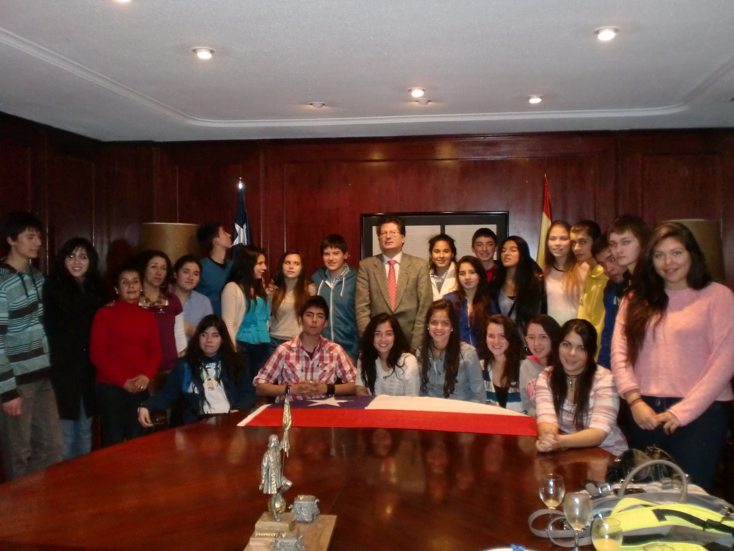 En la sede diplomática de nuestro país, en Madrid, fueron recibidos por el Encargado de Negocios, Ministro Consejero Francisco Fuenzalida quien expuso a la delegación que está integrada, además, por las profesoras, Sarita Salas y Cindi Cifuentes, el buen momento que hoy viven en sus relaciones Chile y España, especialmente, luego de la reciente visita oficial a Santiago que efectuara el Presidente Mariano Rajoy. Los alumnos se interesaron por conocer detalles del funcionamiento de la misión chilena en un interesante diálogo como se registra en las fotos del encuentro.