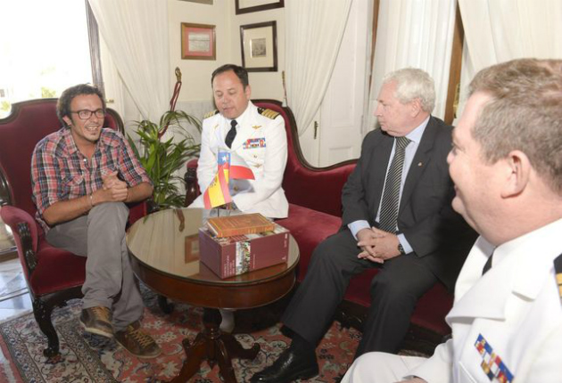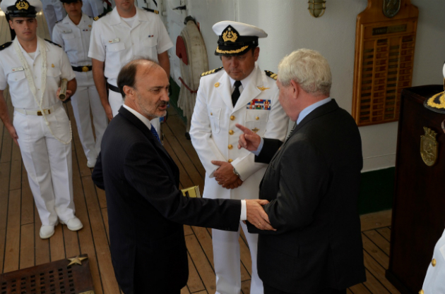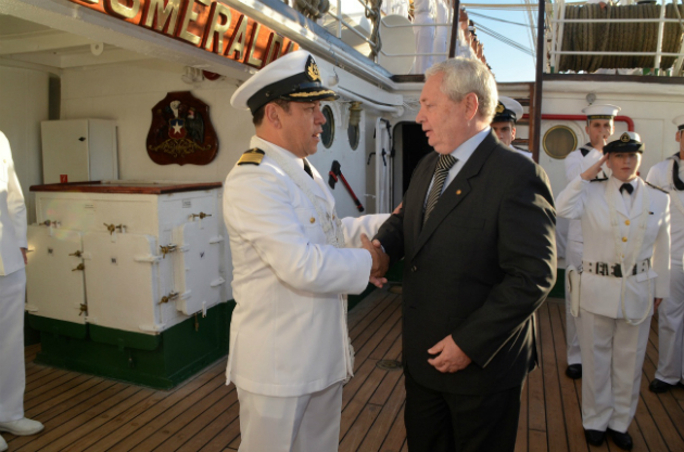 El Comandante del buque-escuela Esmeralda, Capitán de Navío Carlos Fiedler recibe al Embajador de Chile en España, Francisco Marambio Vial.