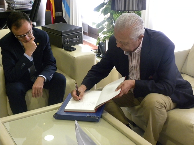 Sergio Romero Pizarro firmó en el libro de honor del Ayuntamiento y acompañado del alcalde realizó una ofrenda floral, con los colores chilenos, a la estatua de Pedro de Valdivia en la Plaza de España.