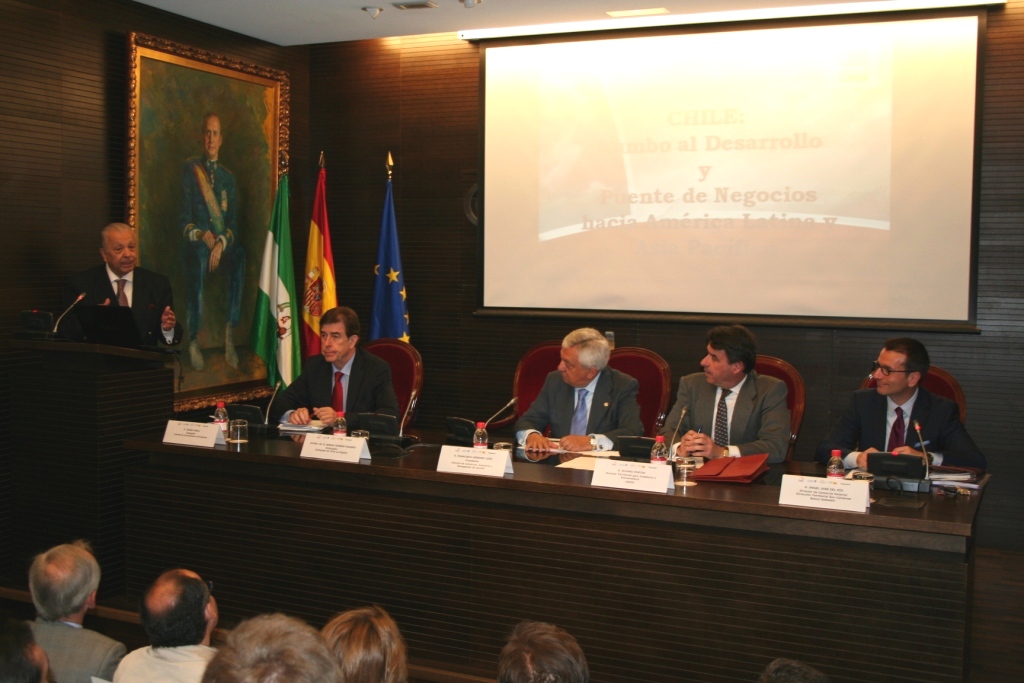 El Embajador de Chile en España, Sergio Romero, agradeció el recibimiento dispensado por las autoridades y asistentes, y dio inició a su ponencia Chile: Rumbo al Desarrollo y Puente de Negocios América Latina y Asia, a través de la cual hizo una completa descripción de las bases y fundamentos de la institucionalidad y economía chilena. Insistió mucho en estos aspectos, resaltando el compromiso de las autoridades públicas y privadas de su país con la transparencia y seguridad jurídica de quienes se asentaban entre nosotros.
