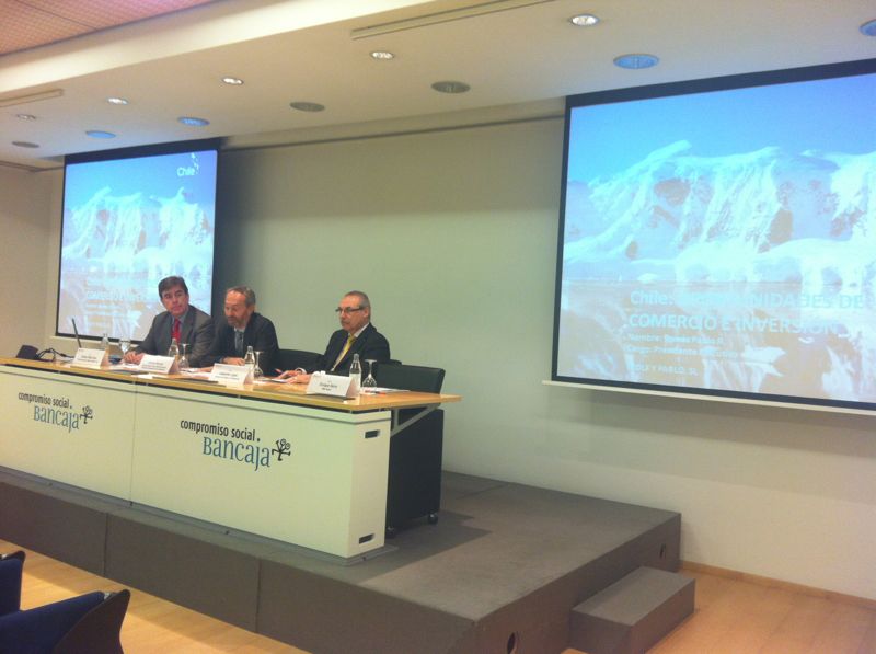 Empresas valencianas interesadas en acudir al mercado chileno con sus bienes y servicios asistieron convocados por Vicente Mompó, Director de Comercio Exterior de la Cámara Oficial de Comercio de Valencia, a la Sala Ausias March de la Fundación Bancaja, a la jornada Situación actual de la economía chilena y sus posibilidades comerciales y de inversiones en los sectores de oportunidad: Agroalimentario, TIC`s y Venta electrónica, Minería y energía, Infraestructuras y Turismo. La delegación chilena estuvo presidida por el Cónsul Honorario de Chile en la Comunidad Valenciana, Leopoldo López Mánez y por el Presidente Ejecutivo de la Consultora Wolf y Pablo, S.L, (W&P SL), Tomás Pablo Roa.
