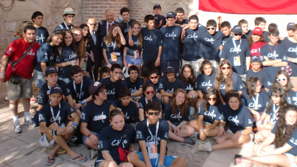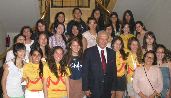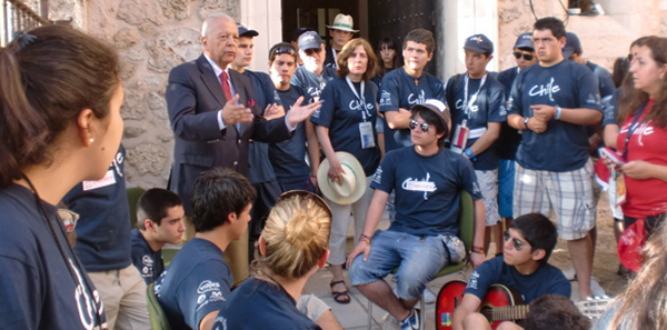 Los más de 3.500 jóvenes chilenos llegados a Madrid se suman a este ambiente de festejo con el mejor de los ánimos, superando, circunstancialmente, los imprevistos respecto de hospedajes y las distancias para quedar finalmente instaladas. Uno de esos grupos compuesto por estudiantes de Chanco, San Ignacio Alonso Ovalle y del Liceo Alemán del Verbo Divino de Chicureo fueron visitados esta mañana por el Embajador Sergio Romero quien les expresó su admiración hacia la juventud chilena congregada en Madrid señalándoles que con tolerancia, arraigados en Cristo y firmes en la fe, como dice el lema de esta jornada mundial, dan un muy buen ejemplo de saber cómo se preparan para enfrentar las dificultades del futuro. Quisiera extender esta admiración a la juventud chilena que se expresa en forma pacífica, como ha ocurrido en Chile en las últimas horas, y también señalar mi optimismo para que a través de los grandes acuerdos en la educación, seamos capaces de coronar con buenos resultados, para salir adelante en beneficio de todos, afirmó el Jefe de la Misión chilena en España.