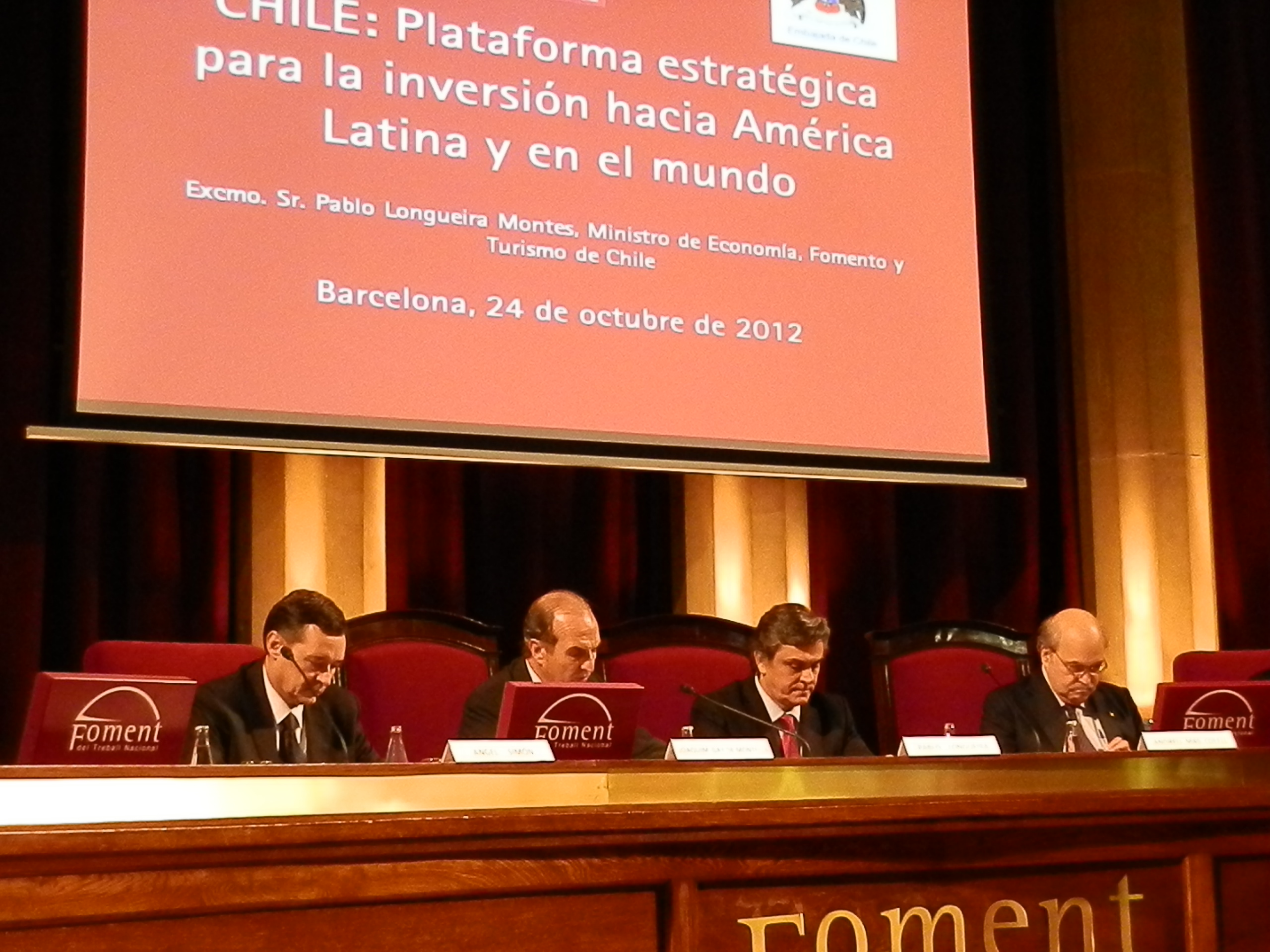 En Fomento del Trabajo, asociación empresarial con antecedentes en la Real Compañía de Hilados de Algodón de 1771, cuyo nombre actual data de 1889, su actual presidente Joaquim Gay de Montellà; junto el consejero de Economía de la Comunidad Autónoma de Cataluña, Andreu Mas-Colell, y el presidente del Comité Bilateral Empresarial España-Chile, Ángel Simón, dieron la bienvenida al Ministro Pablo Longueira y a las autoridades chilenas que lo acompañaban.
