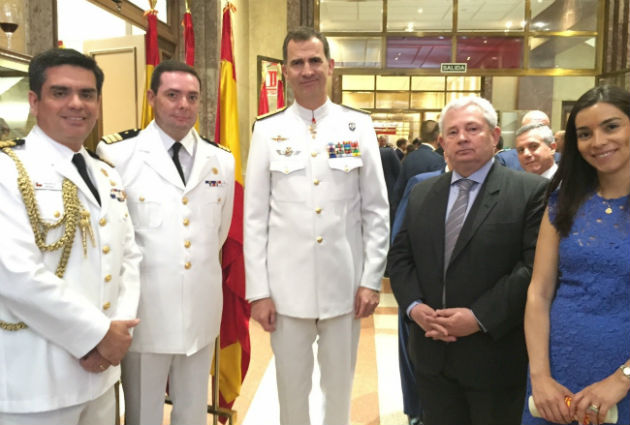 El Agregado Naval CN Mauricio Arenas, el CF. Fabián González, el Rey de España Felipe VI, el Embajador de Chile en España Francisco Marambio y Paola Ortiz de González.