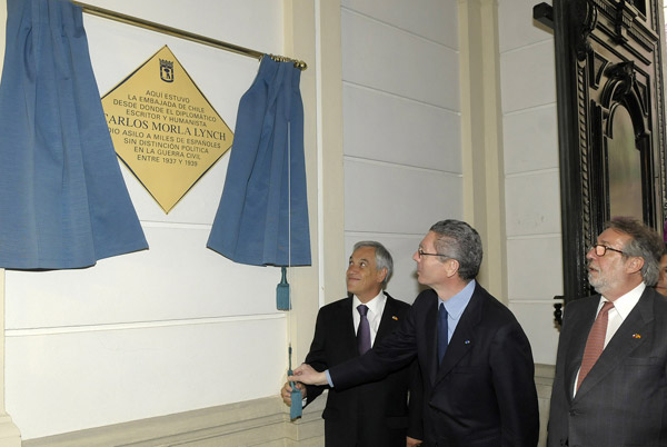 Un extraordinario homenaje al diplomático chileno Carlos Morla Lynch ( 1885-1969) rindió el Presidente Sebastián Piñera durante su visita a España al descubrir una placa recordatoria, instalada en el mismo edificio donde estuvo habilitada la Embajada de Chile durante la Guerra Civil de España.