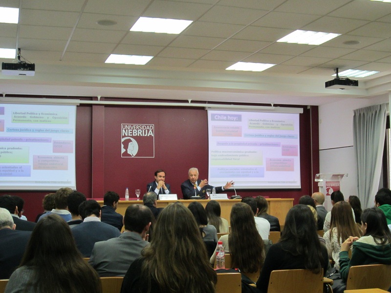 Un centenar de estudiantes de la Universidad de Nebrija tuvieron la ocasión de reunirse con el Embajador de Chile en España, Sergio Romero Pizarro. El representante diplomático expuso el tema "Chile: fortaleza institucional y plataforma de acceso a otros mercados", en el marco del Ciclo sobre experiencias de internacionalización de empresas españolas en mercados emergentes, organizada por la Cátedra Nebrija-Santander y la Escuela de Derecho y Relaciones Internacionales de la mencionada casa de estudios.