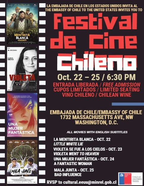 Entre el 22 y 25 de octubre próximo, se llevará a cabo en la Embajada de Chile en Estados Unidos, el Festival de Cine Chileno, con el objetivo de promover nuestra cultura cinematográfica.
