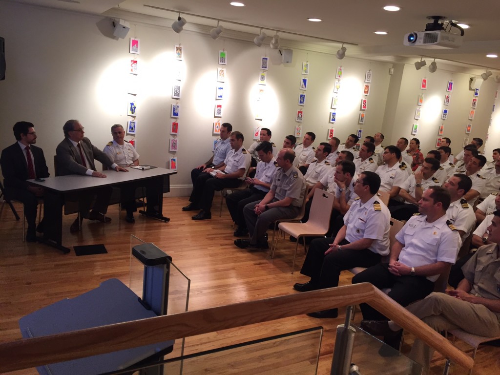 Un total de 54 alumnos e instructores de la Academia de Guerra Naval de Chile llegaron hasta la Embajada en Washington DC, donde fueron recibidos por el embajador Juan Gabriel Valdés.