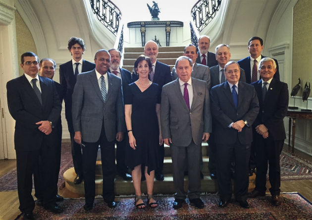 Fueron doce los embajadores que llegaron hoy, hasta la residencia oficial de Chile en el 2305 de Massachusetts Ave, en Washington DC, para participar en el almuerzo que el jefe de la delegación nacional, Juan Gabriel Valdés brindó en honor de la nueva embajadora de Estados Unidos en México, Roberta Jacobson quien hasta hace un mes se desempeñó como Secretaria de Estado Adjunto para América Latina.