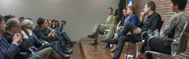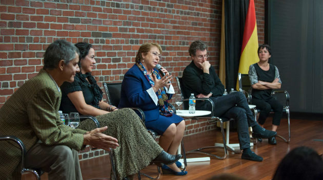 La primera de ellas se desarrolló el lunes 28 de septiembre a las 16 horas, en el Instituto Cervantes de Nueva York donde la Mandataria, acompañada del canciller Heraldo Muñoz y el embajador Juan Gabriel Valdés, sostuvo un interesante encuentro con los artistas chilenos que viven y trabajan en Manhattan.