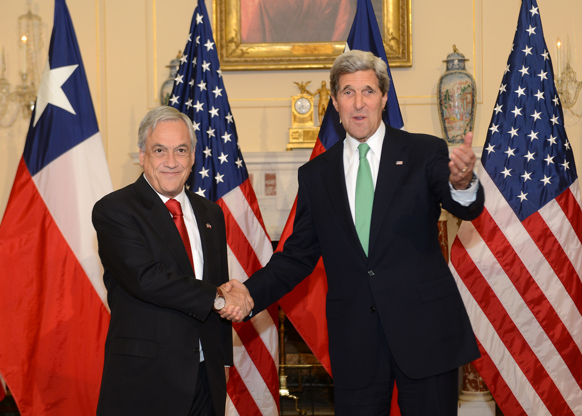 El Presidente de la República Sebastián Piñera, acompañado del Canciller Alfredo Moreno, se reunió con el Secretario de Estado de Estados Unidos, John Kerry, en Washington D.C. en el marco de su visita de oficial de trabajo a dicho país.