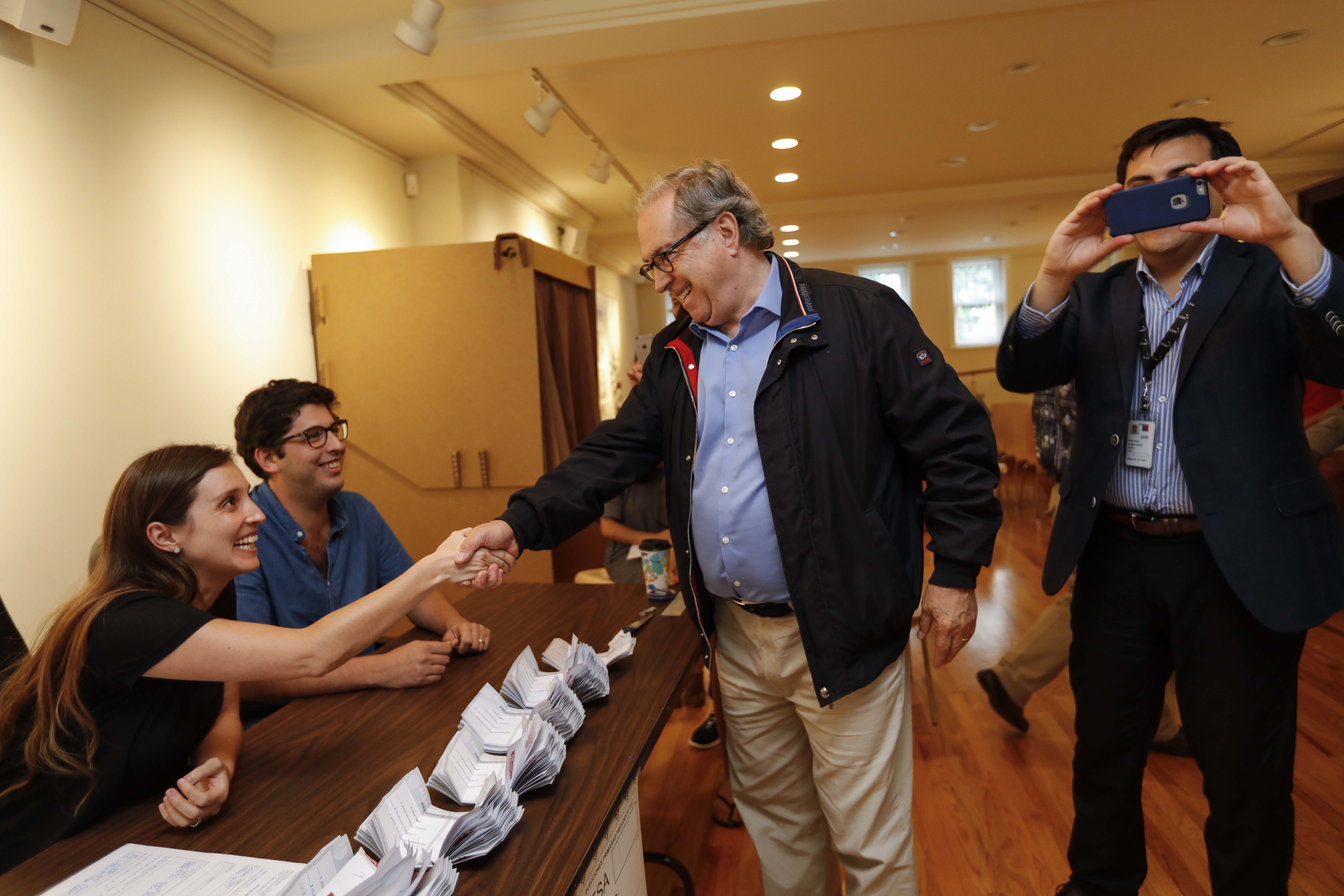El embajador de Chile ante la Casa Blanca, Juan Gabriel Valdés, saluda a los integrantes de la mesa de votación para los chilenos residentes en Washington DC en la Embajada de Chile en Estados Unidos. Por primera vez en la historia los connacionales residentes en el extranjero pueden participar de los procesos eleccionarios.