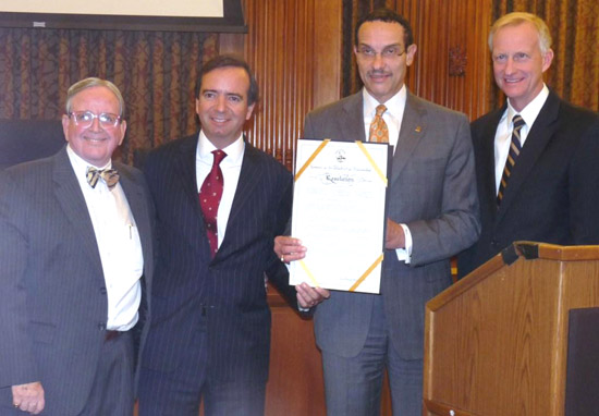 Washington, 12 de noviembre de 2010.- La Alcaldía de Washington D.C. aprobó hoy viernes una resolución de honor dirigida a los 33 mineros chilenos. El recién electo alcalde, Vincent Gray, fue quien entregó al embajador de Chile en Estados Unidos, Arturo Fermandois, esta resolución que declara el día 12 de noviembre como la fecha oficial de celebración de los mineros rescatados en Copiapó. La celebración no sólo se refiere a la fecha del presente año, sino a todos los 12 de noviembres.