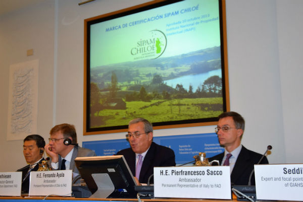 El representante permanente de Chile ante la FAO, embajador Fernando Ayala, presentó la experiencia del SIPAM Archipiélago de Chiloé, en el evento sobre los Sistemas Importantes del Patrimonio Agrícola Mundial (SIPAM), que se efectuó el 28 de septiembre, en el marco del 25 período de sesiones del Comité de Agricultura ( COAG) que se realizó la última semana de septiembre en Roma. En el evento se presentaron también las experiencias de los SIPAM de China, Japón, Italia y Marruecos.