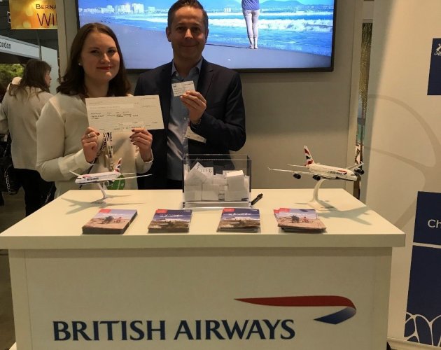 (de izq. a dcha.) Sra Krista Ahonen ganadora del sorteo de 2 pasajes en World Class Traveller con British Airways, y Sr. Ulrik von d´Ahé, Gerente de ventas de clientes de British Airways