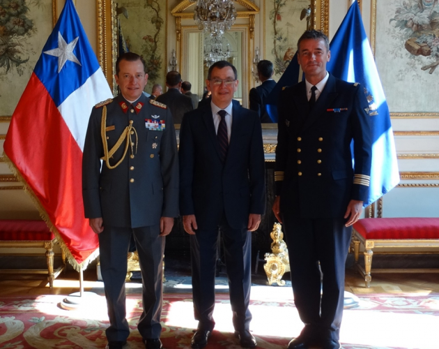 Crl. Ricardo Stangher Q., Agregado Militar y Naval a la Embajada de Chile en Francia, Sr. Oscar Alcamán, Ministro Consejero y Encargado de Negocios de la Embajada de Chile en Francia y Capitaine de Vaisseau Yves Le Corre, Jefe de la Oficina de Relaciones Internacionales y de la Estrategia del Estado Mayor Conjunto de Francia
