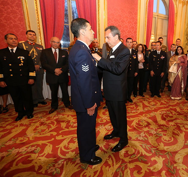 En la oportunidad S.E. el Embajador Sr. P. Hales D., impuso la condecoración al Mérito Militar de las Fuerzas Armadas, en el grado Gran Mérito Militar, por 30 años de servicio en la Institución, al Suboficial Claudio Ossandón Ruiz, Secretario de la Agregaduría Aérea; enfatizando la trayectoria del Suboficial, su formación valórica y profesional en la FACH.