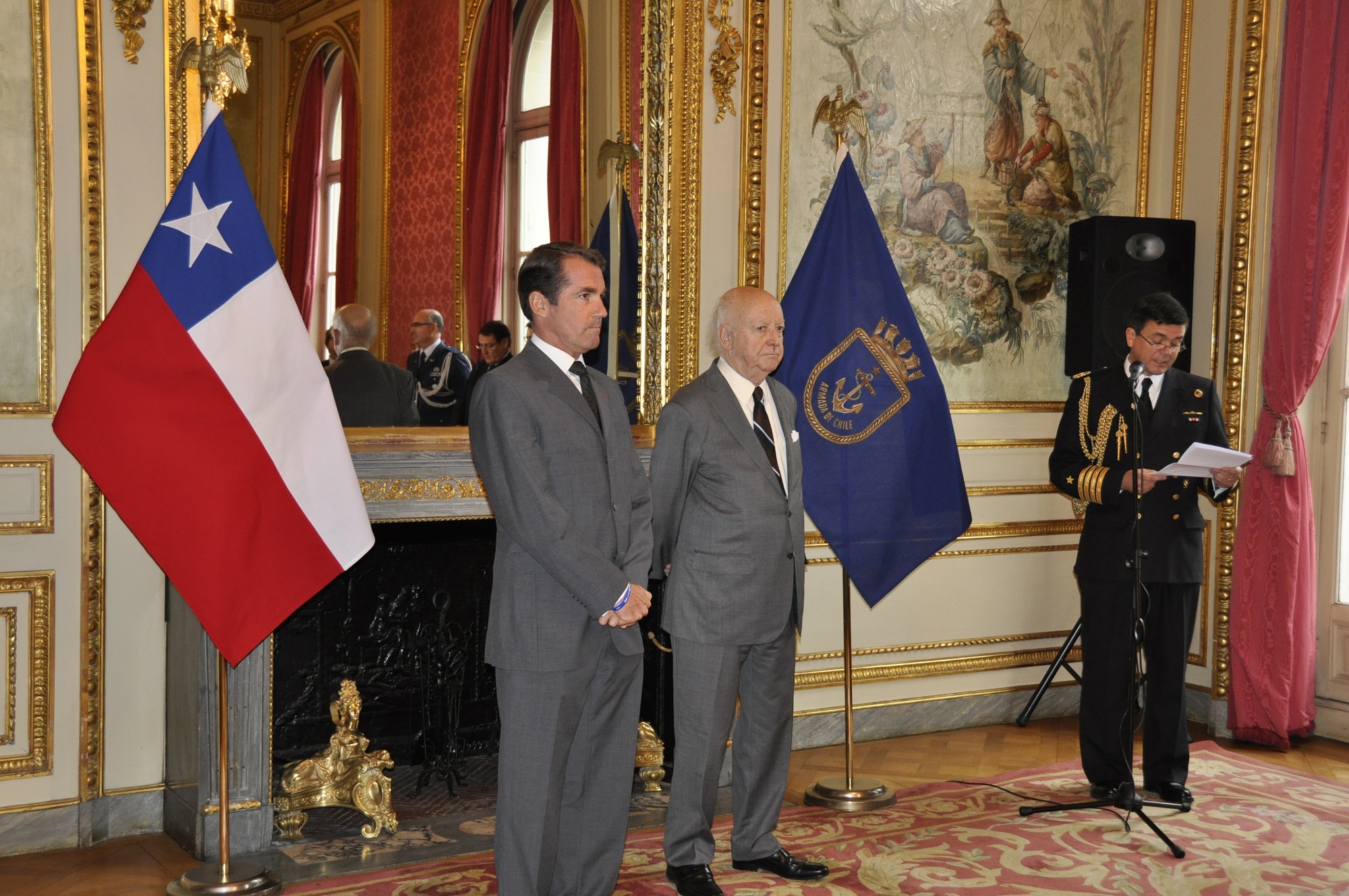Impuso las condecoraciones el Embajador de Chile en Francia, señor Jorge Edwards, acompañado por el Agregado Militar y Naval, Capitán de Navío señor Carlos Schnaidt.