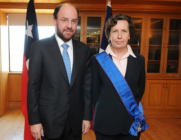 El Canciller Alfredo Moreno condecoró con la Orden al Mérito de Chile" en el grado de "Gran Cruz" a la Embajadora de Francia en Chile, Maryse Bossière, distinción que expresa el reconocimiento a sus destacados esfuerzos en favor de las relaciones entre Chile y Francia, desde que asumió su cargo en septiembre de 2008.
