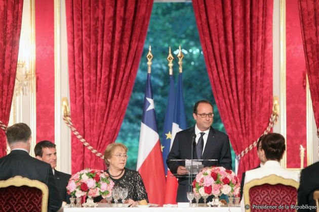 Los días 8 y 9 de junio SE la Presidenta de la República Michele Bachelet realizó una visita oficial a Francia, en la que desarrolló un intenso programa de actividades y que permitió profundizar y consolidar el excelente nivel de las relaciones bilaterales entre Francia y Chile. Su programa de actividades contempló reuniones con el Presidente François Hollande, con el Primer Ministro Manuel Valls, con los presidentes de la Asamblea Nacional y el Senado, diputado Claude Bertolone y senador Gérad Larcher respectivamente.