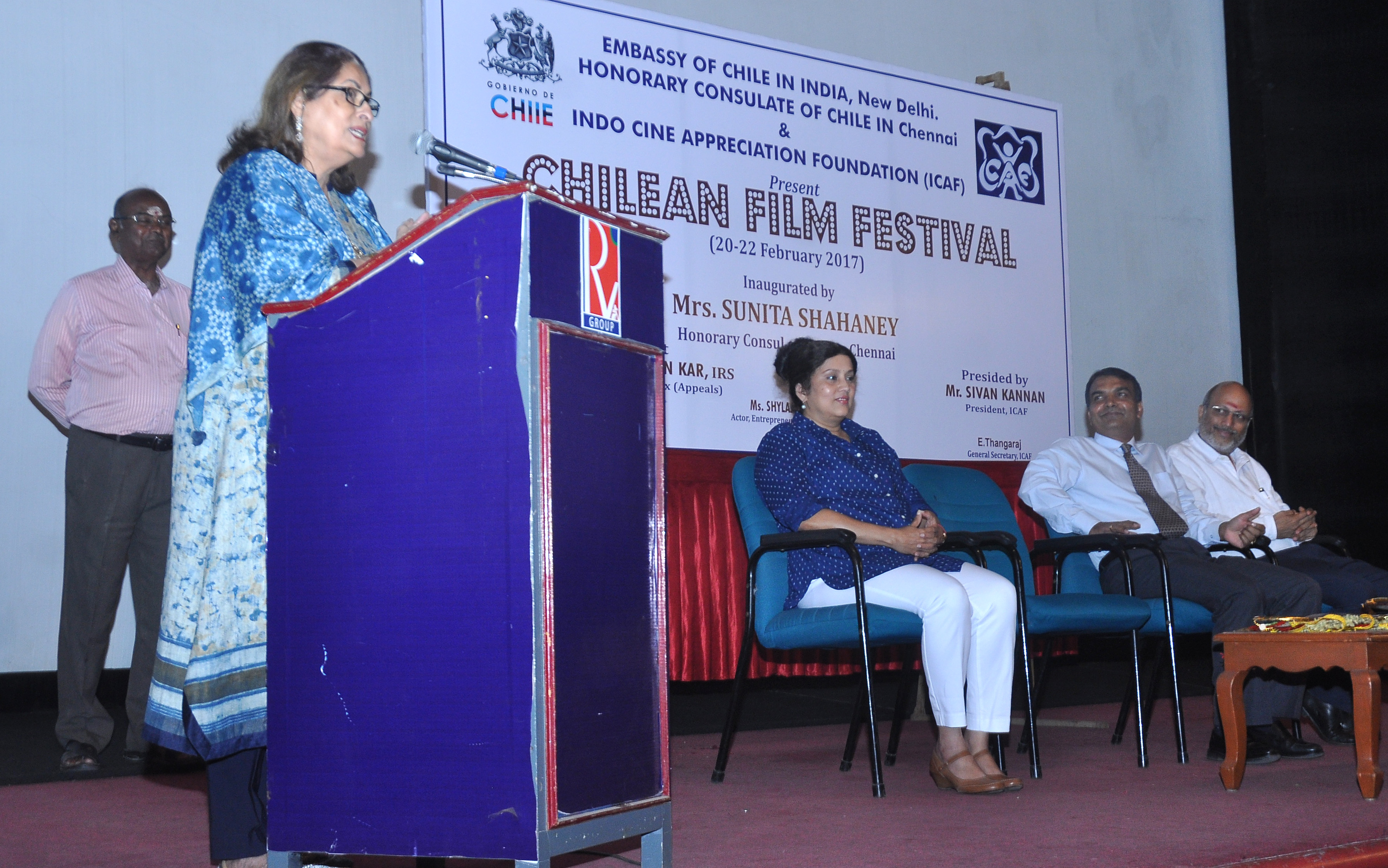 La Embajada de Chile en India, el Consulado Honorario de Chile en Chennai y la Fundación Apreciación de Cine India (ICAF por sus siglas en inglés) organizaron el I Festival de Cine Chileno en Chennai, evento que tuvo lugar entre los días 20 y 21 de febrero de 2017 en el Salón Alfombra Roja del reconocido centro de Televisión & Filmes RVK, el cual contó con la presencia dela Cónsul Honoraria de Chile en Chennai, Sra. Sunita Shahaney, y del Director General del ICAF, Sr. E. Thangaraj.