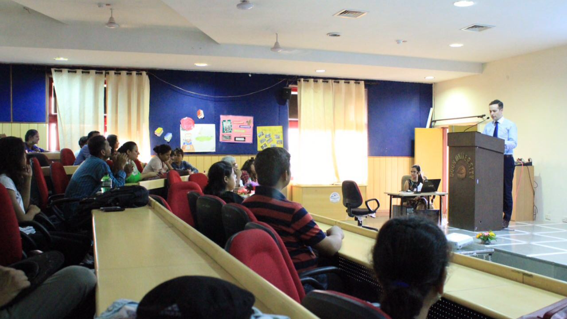 Dehradun, 9 de septiembre de 2016: El Encargado de Asuntos Culturales de la Embajada de Chile en India, Sr. Manuel José Saldías, y el profesor hispanista de Nueva Delhi, Sr. Aparajit Chattophadyay, fueron invitados por la Universidad de Doon de la ciudad de Dehradun, Estado de Uttarkhand, India, donde fueron bienvenidos por los académicos y alumnos de la cátedra de Español del Departamento de Lengua Hispana de ese centro de estudios superiores.