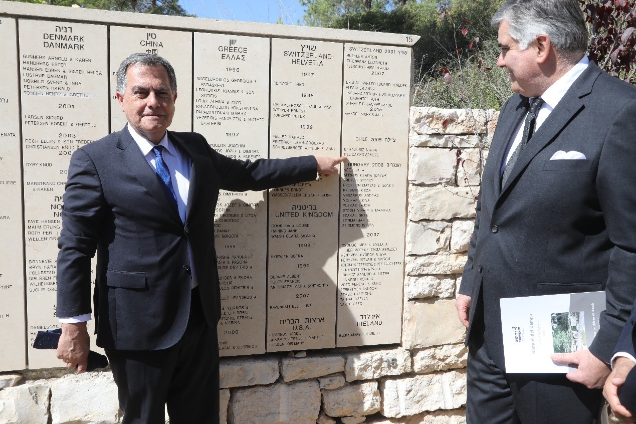 El domingo 22 de Octubre de 2017 con la presencia del Sr. DIGEN, Embajador Milenko Skoknik, el Encargado de Negocios de la Embajada de Chile en Israel PS Allan Najum , la SS y Cónsul en Tel Aviv Andrea Quezada, el representante de la familia Del Campo, Dr. Christian Beals Campos, el Director de Protocolo de Estado, Embajador Meron Reuben, el Director General Adjunto del Ministerio de Relaciones Exteriores de Israel, Embajador Modi Ephraim, personal de la Embajada y de sus Agregadurías militares, autoridades locales, invitados especiales y una significativa participación de la comunidad chilena residente, tuvo lugar en la "Sala del Recuerdo" ("Hall of Remenbrance") en la Autoridad del Recuerdo de los Mártires y Héroes del Holocausto ("Yad Vashem"), un servicio religioso en reconocimiento como "Justo entre las Naciones" al ex diplomático Samuel del Campo Candia (QEPD).