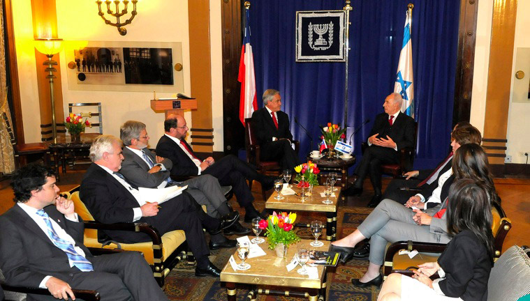 El encuentro bilateral fue protagonizado por el Presidente Sebastián Piñera y su homólogo el Presidente Shimon Peres, a la reunión también asistieron el Canciller Alfredo Moreno, el Ministro Juan Andrés Fontaine y el Embajador Joaquín Montes.