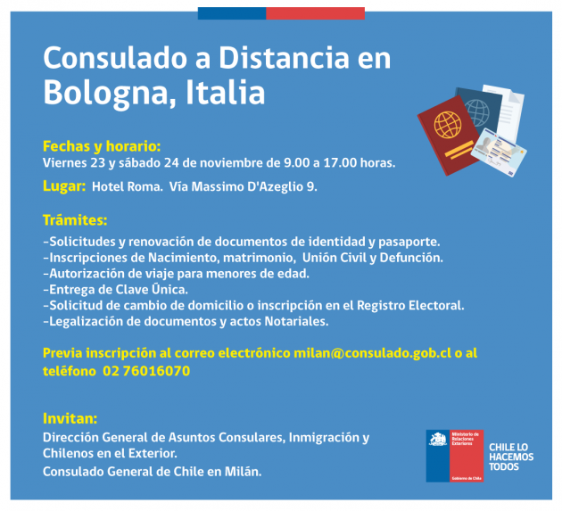 El Consulado General en Milán, realizará un Consulado a Distancia en la ciudad de Bologna, durante los días viernes 23 y sábado 24 de noviembre.