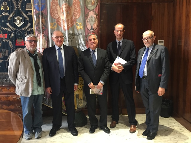 En la Universidad La Sapienza, de izq. a derecha: Luciano Vasapollo, encargado de Relaciones Internacionales para Latinoamérica y el Caribe; profesor Claudio Grossman, Embajador Fernando Ayala, profesor Alessandro Saggioro y Antonello Folco, Vicerrector y presidente Fundación Roma Sapienza.