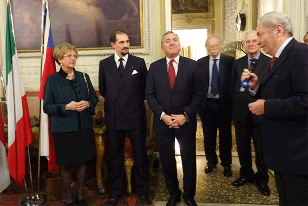 Enrica Dufour, viuda de Chiavari; Gian Luca Chiavari, cónsul honorario en Génova, y embajador Fernando Ayala, escuchan al cónsul honorario de Turquía, Giovanni Guicciardi.
