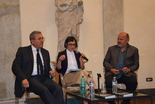 Embajador Fernando Ayala, editora italiana Valentina Vignoli y Horacio Salinas, presentando su libro La Canción en el sombrero.