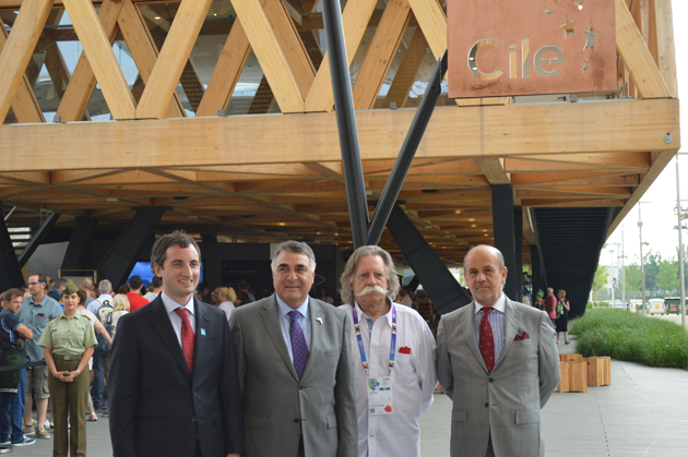 En visita a la Expo Milán, acompañan al Subsecretario Edgardo Riveros, el gerente del pabellón Guillermo Ariztía; el director de la Oficina Comercial de Pro-Chile, Augusto Aninat , y el Cónsul General de Chile en Milán, Guillermo Martínez