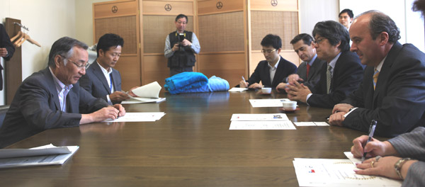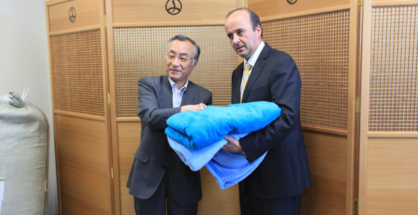 El Embajador de Chile en Japón, Sr. Patricio Torres, hizo entrega al Alcalde de Chiyoda-ku, Sr. Masami Ishikawa, de la donación del Gobierno de Chile de 2 mil frazadas para las víctimas del terremoto y tsunami del 11 de marzo en Japón.
